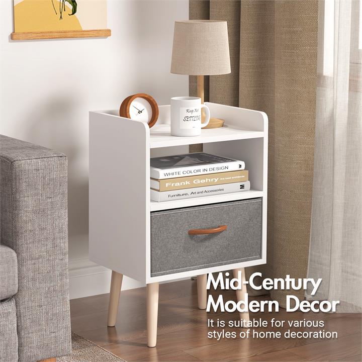 Advwin Mid-century Modern nightstand. The bedside cabinet is made of durable E1-rated 15mm thick particleboard with scratch-resistant surfaces and an open top plate that can accommodate lamps, clocks and other decorations. Single/double layer nightstand with a movable 35*28*14.5 cm fabric drawer for books, diaries or personal necessities. The four legs made from solid wood are stably placed in a splayed shape to prevent wobbling. At the same time, the legs are equipped with non-slip rubber pads at the bottom, which can prevent the floor from scratching and reduce noise when moving. Bedside cabinet surface with environmentally friendly melamine finish design, easy to clean and maintain. The classic white bed side table measures 40*30*62cm and is suitable for a variety of uses: not only as a bedside cabinet, but also as a coffee table next to the sofa, a side table for guests in the living room, or for the storage of nursery toys. The package comes with detailed instructions to help you assemble faster and easier.