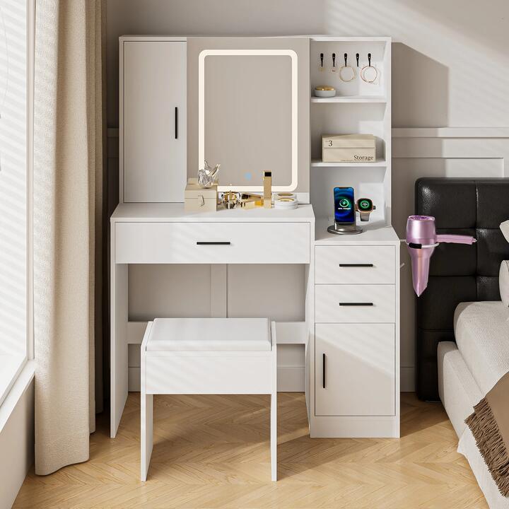 Enhance your daily makeup routine with the Advwin dressing table. This makeup table features a built-in charging station with 2 USB ports and 2 AC outlets for convenient device charging.The HD LED lighted mirror offers adjustable brightness and 3 color options to suit your needs. You can stay organized with ample storage, including jewelry cabinets, sliding hidden shelves, side cabinets with adjustable shelf, drawers, makeup worktable, and so on. This fashionable and practical dressing table is the perfect gift for your lover on special occasions, perfectly combining functionality with elegance.