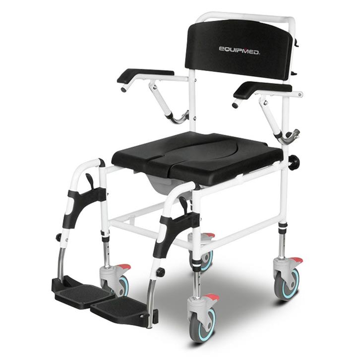 Equipmed Commode Shower Chair, Over Toilet or Bedside 136kg Capacity Aluminium frame with Wheels, Black