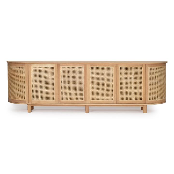 Sandestin American Oak Timber & Rattan 6 Door Curved Sideboard, 300cm, Natural